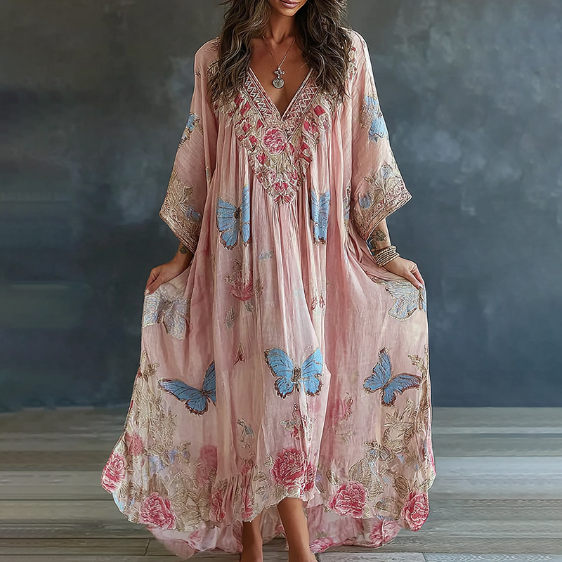 Women's Floral And Butterfly Art Print Flowy Linen Blend Casual Maxi Dress