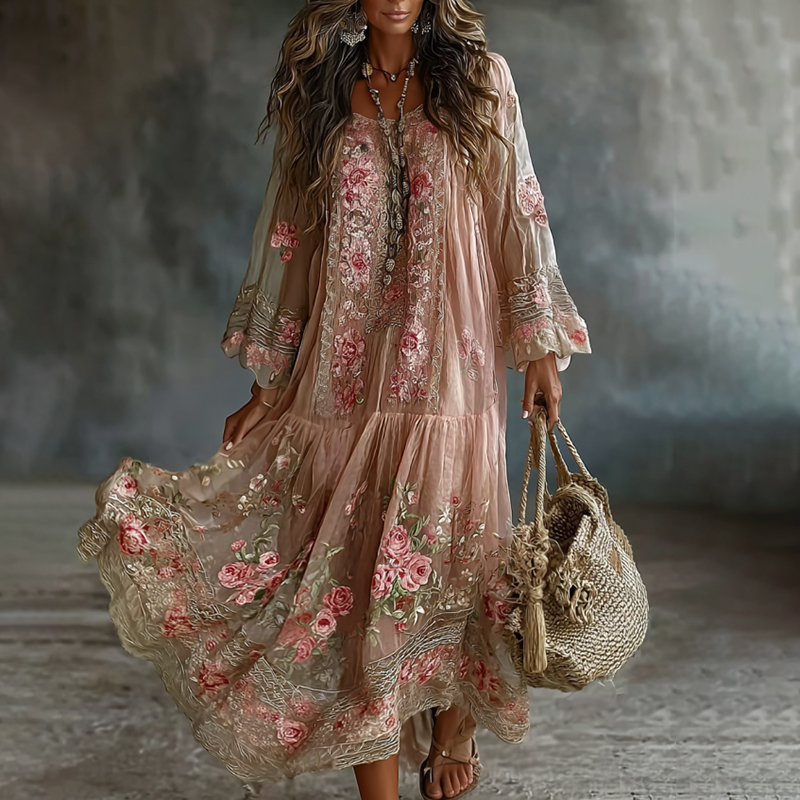 Women's Floral Art Flowy Linen Blend Casual Long Sleeve Maxi Dress