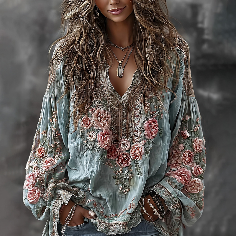 Women's Retro Floral Embroidered Art Print Flowy Linen Blend Casual Tops