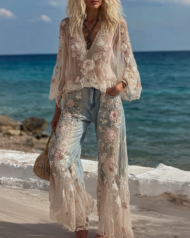 Women's Spring Resort Floral Embroidered Top & Pants Two-Piece Set6102