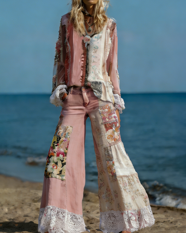 Women's Spring Resort Floral Embroidered Top & Pants Two-Piece Set6839