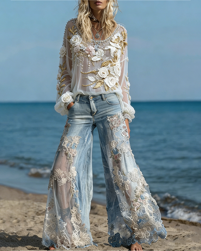 Women's Spring Resort Floral Embroidered Top & Pants Two-Piece Set8008