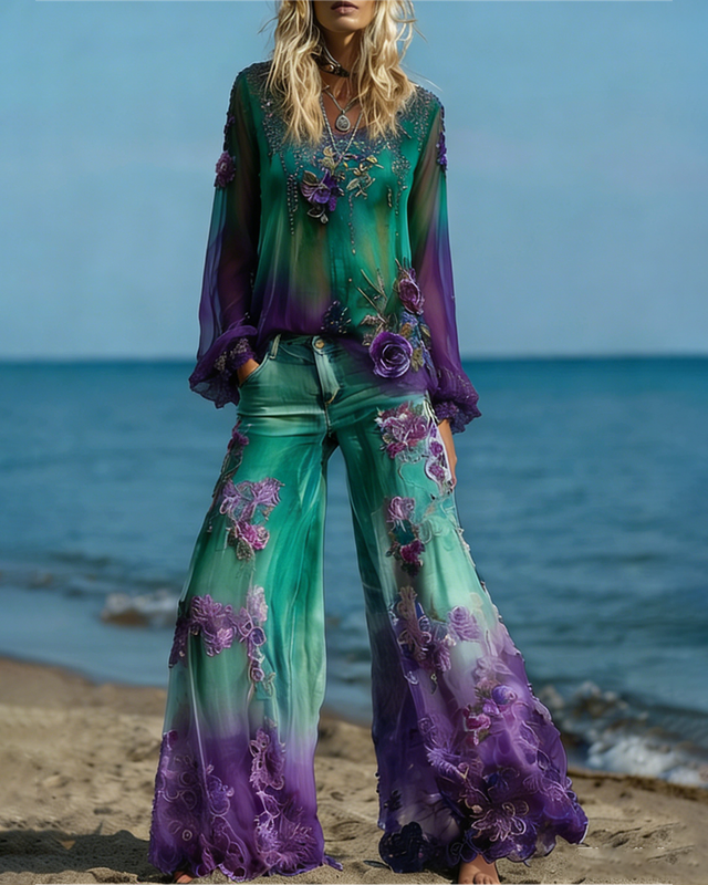 Women's Spring Resort Floral Embroidered Top & Pants Two-Piece Set9532